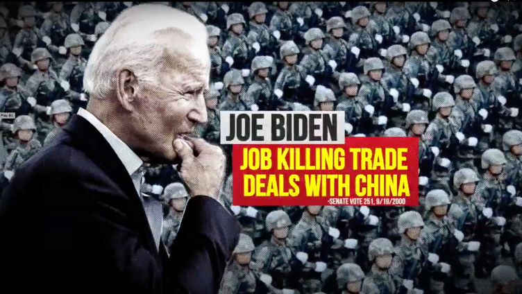 NARRATOR: Biden voted for job killing trade deals with China and failed to support the China travel ban to stop Coronavirus.
